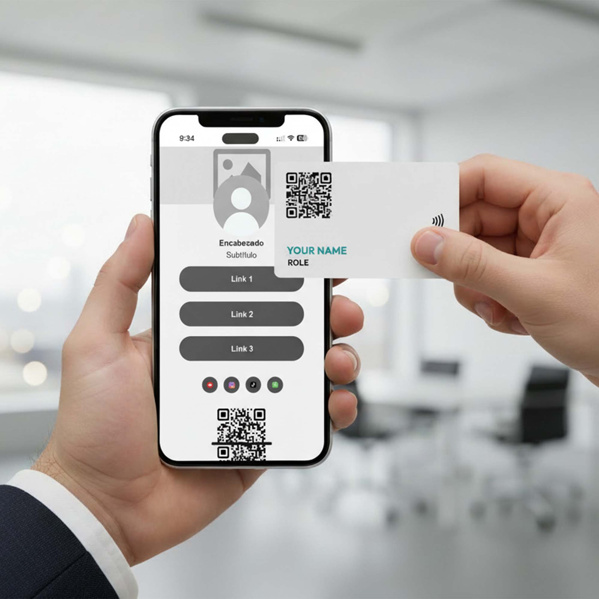 La puerta de entrada a tu mundo digital. Diseñada para el profesional moderno que busca practicidad sin perder el estilo. Con un acabado limpio y elegante en PVC de alta resistencia, es nuestra opción más versátil. Incluye tu Landing Page y tecnología NFC de respuesta inmediata. Ideal para profesionales y equipos dinámicos